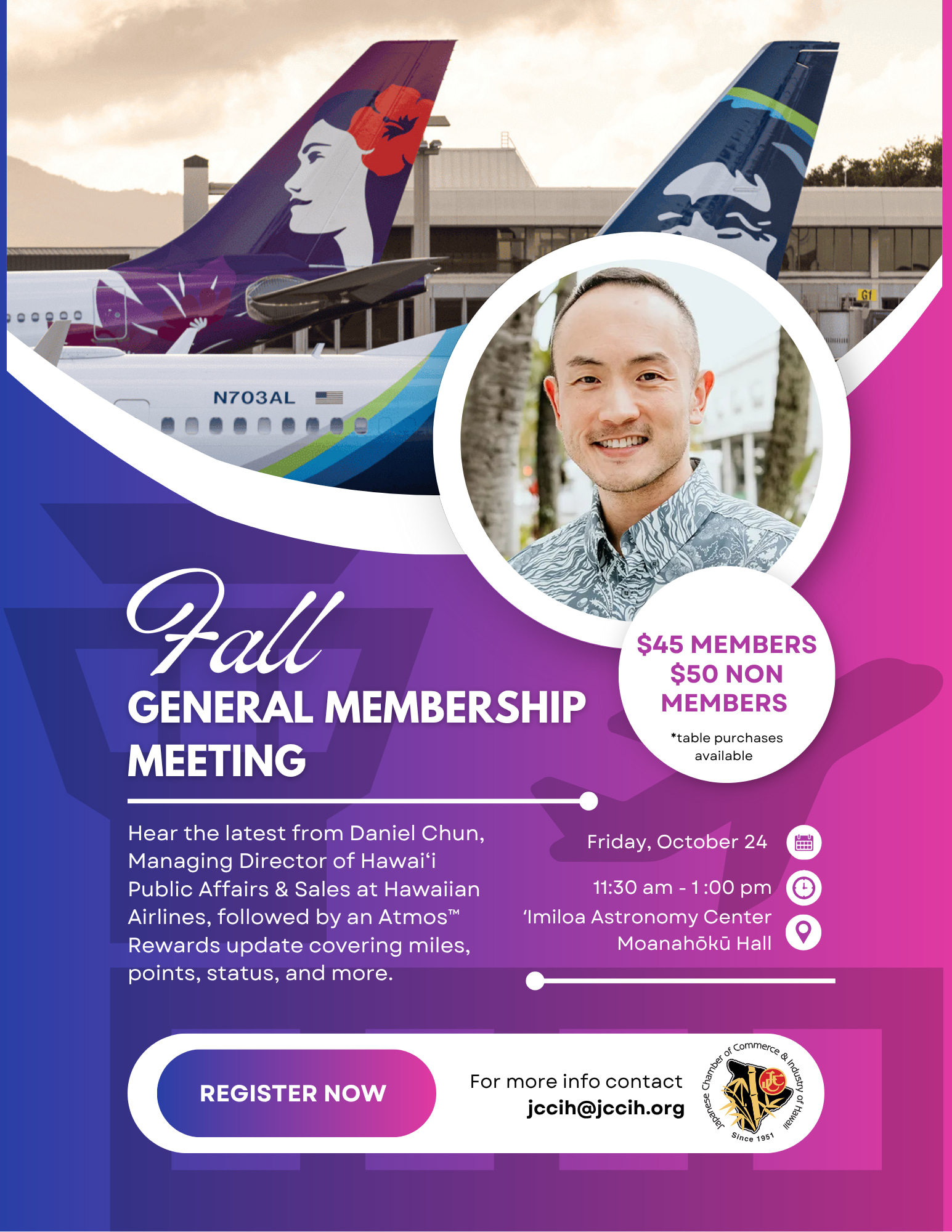 Join us for our Fall General Membership Meeting at the ʻImiloa Astronomy Center, Moanāhōkū Hall. Along with important Chamber updates, we’re pleased to welcome Daniel Chun, Managing Director of Hawai‘i Public Affairs & Sales at Hawaiian Airlines, who will share the latest from Hawaiian Airlines. His presentation will be followed by an Atmos™ Rewards update, highlighting changes and enhancements to miles, points, status, and more.