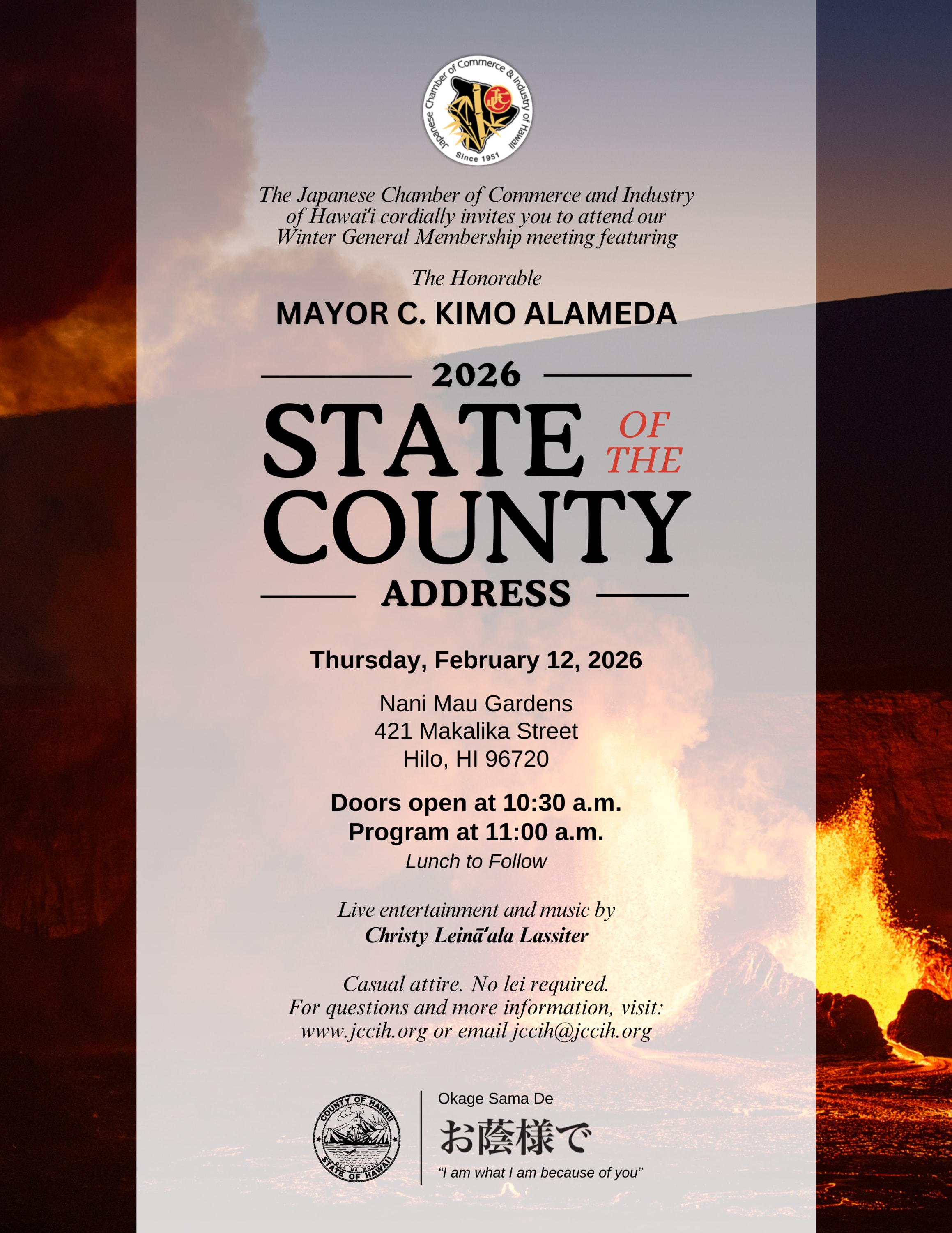 State of the County Address 2026 Hosted by the Japanese Chamber of Commerce and Industry of Hawaiʻi in partnership with the County of Hawaiʻi Join the Japanese Chamber of Commerce and Industry of Hawaiʻi and the County of Hawaiʻi for the 2026 State of the County Address, featuring Mayor C. Kimo Alameda. This annual gathering brings together business leaders, nonprofit partners, and community members from across Hawaiʻi Island to hear directly from the Mayor about the priorities, challenges, and opportunities shaping our county. The address offers a valuable look at where Hawaiʻi County is headed and how government, business, and community organizations can work together in the year ahead. The program will be held on Thursday, February 12, 2026, at Nani Mau Gardens in Hilo. Doors open at 10:30 a.m., with the program beginning at 11:00 a.m., followed by lunch. The event will also feature live entertainment and music by Christy Leināʻala Lassiter. Hosted as JCCIH’s Winter General Membership Meeting, the State of the County Address reflects the Chamber’s ongoing commitment to strengthening relationships between the business community and local government, and to supporting a healthy, connected, and resilient Hawaiʻi Island. Rooted in the spirit of Okage Sama De, “I am what I am because of you,” this event honors the partnerships and shared responsibility that help our county thriveImages